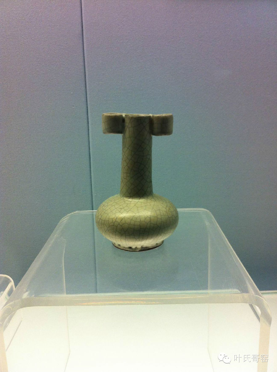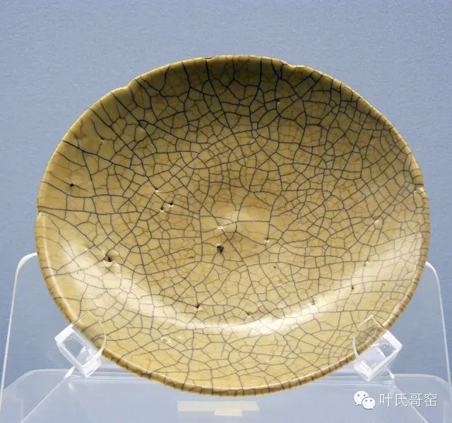 哥窑胎多紫黑色.铁黑色.也有黄褐色。釉为失透的乳浊釉,釉面泛一层酥光,釉色炒米黄.灰青多见,釉面大小纹片结合,经染色后大纹片呈深褐色,小纹片为黄褐色,也称(金丝铁线)或(文武片)。这是传世哥窑的主要特征之一。器形有格式瓶.炉.尊.洗及碗.盆.碟等。多见仿古造型,底足制作部十分规整,釉面常见缩釉和棕眼。