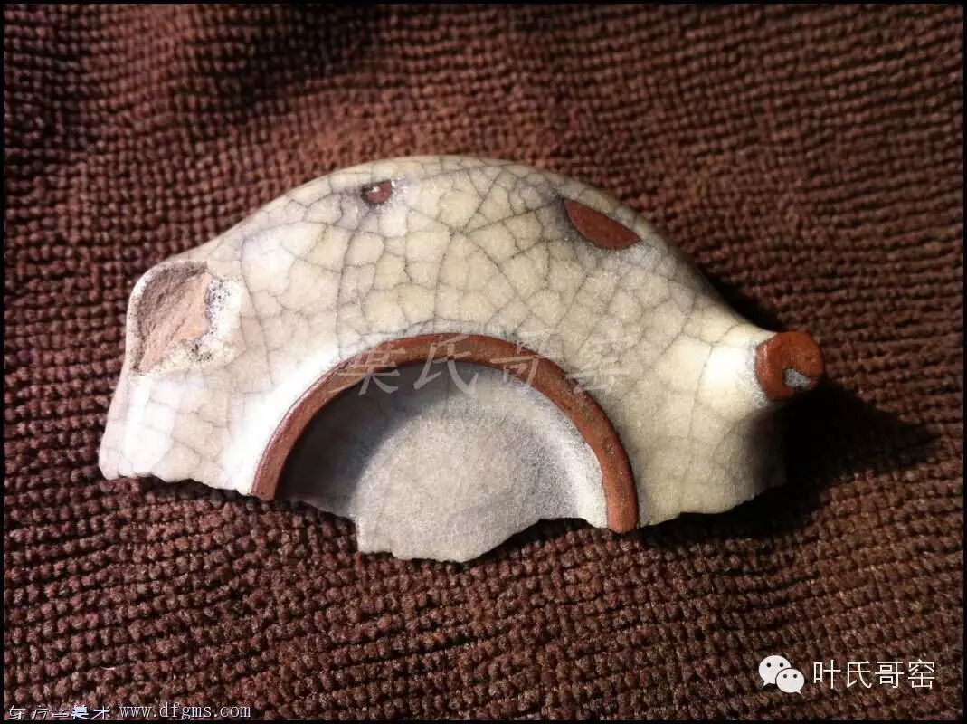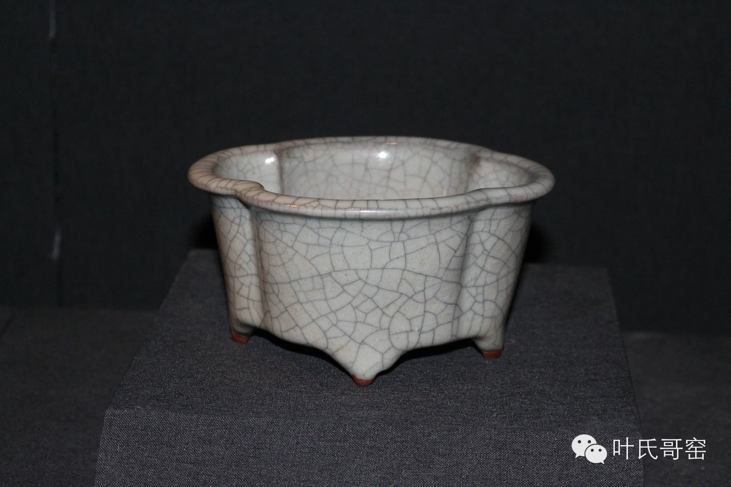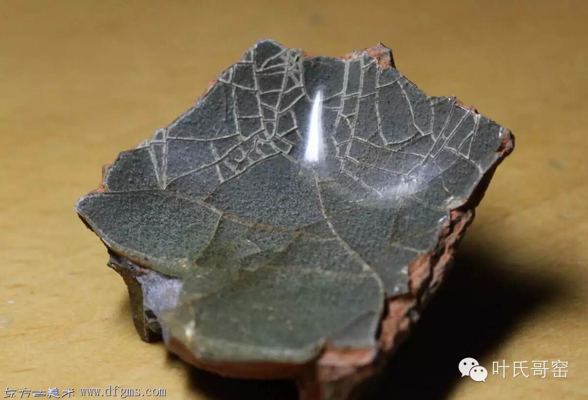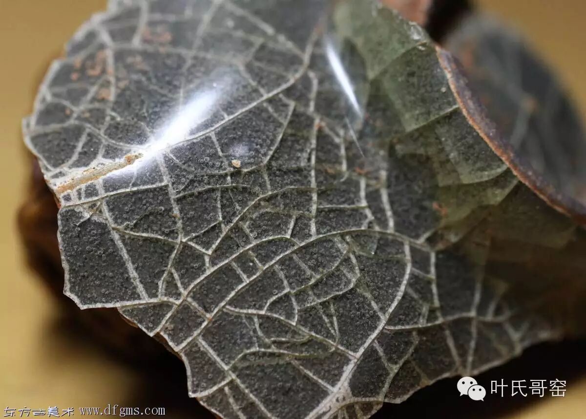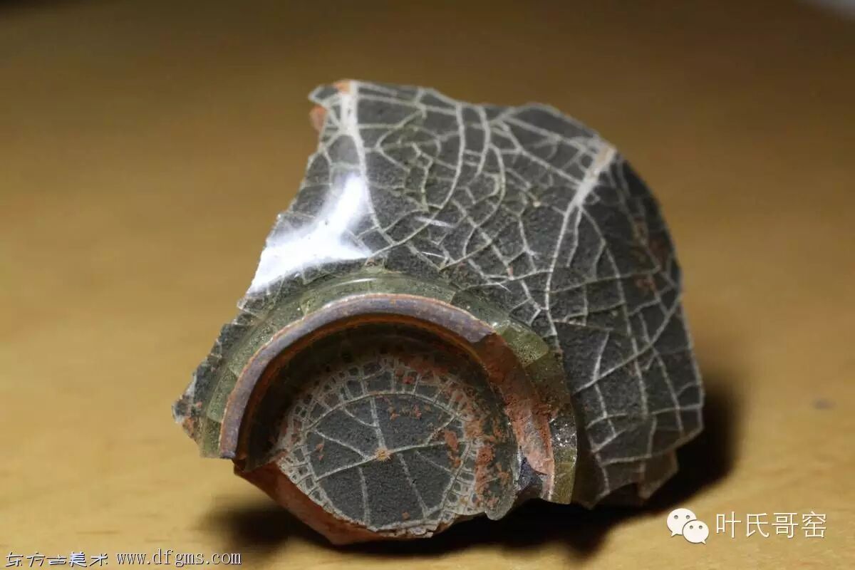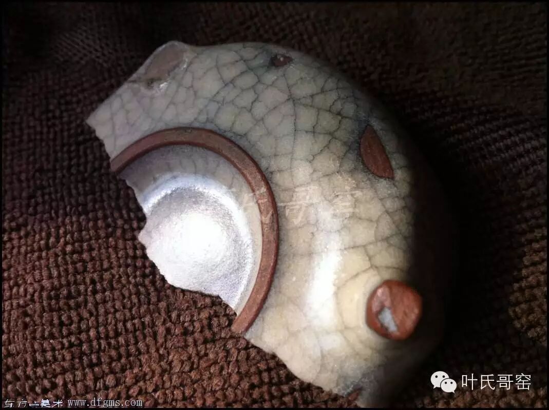 传世哥窑有“紫口铁足”“金丝铁线”这一描素,古文献对开片形状描述为“鱼子纹、蟹爪纹、、膳血纹、叶脉纹、梅花墨纹、文武开片”等。属于(人为沁色和包浆沁色)。